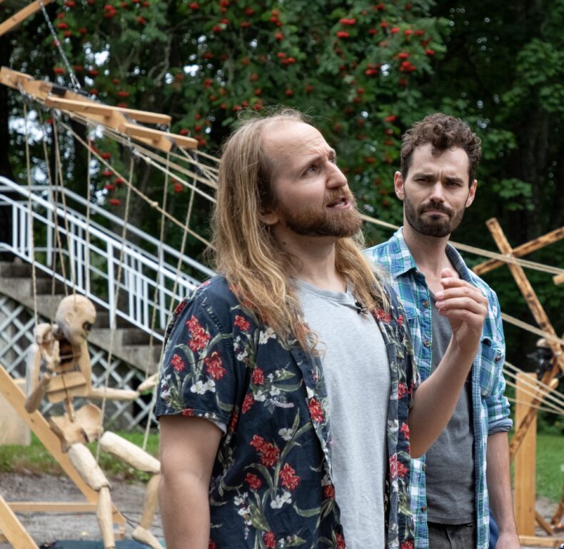 Freestyle rapduo Repe & Kemia, taustalla Aapo Repon jättimarionetit. Muurlan Wanhan Ajan Markkinat 2024, kuva Anne Nenonen.